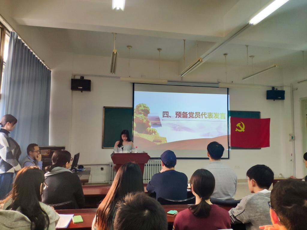 在高亢的国际歌声中,入党宣誓仪式正式开始。王紫山宣读了参加宣誓的预备党员名单。在领誓人张驰的带领下,18名新党员举起右拳,面向党旗庄严宣誓,表达了为共产主义奋斗终身的决心。2016级王文欣同志代表新党员发言,她表示作为一名新党员,在学习、工作和生活中要时刻保持党员的先进性,积极贯彻党的宗旨意识,经常性开展批评与自我批评,努力提高自己的思想境界。2016级王琳琳同志代表老党员发言,她对新发展的党员表示祝贺,同时结合自身经历,讲述了加入党组织以来的成长与收获,鼓励新老党员相互监督、相互学习、共同进步,用实际行动践行入党誓词。王鹏飞代表学院党委向新党员表达了衷心的祝贺,并要求新党员们自觉遵守党章,践行党员义务,在党爱党、在党言党、在党为党,在以后的学习、生活和各方面的工作中都要严格要求自己,脚踏实地,努力提高自己服务社会的能力,在充分发挥党员先锋模范作用的同时,为祖国建设贡献自己的力量。