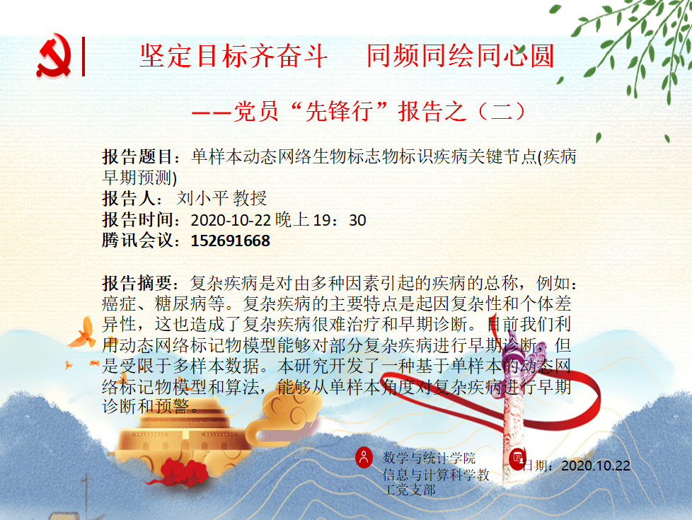 本站讯 为进一步发挥党员先锋引领作用,团结带领师生同心同向同行,共同促进学院及学校事业发展,2020年10月22日晚19:30,77779193永利信息与计算科学党支部组织开展了第二期“坚定目标齐奋斗 同频同绘同心圆——党员‘先锋行’报告”。本次活动由信息与计算科学系教工党支部书记亓兴勤主持,支部党员刘小平教授担任主讲人,信息与计算科学系教师及学院信息与计算科学系部分学生参加。