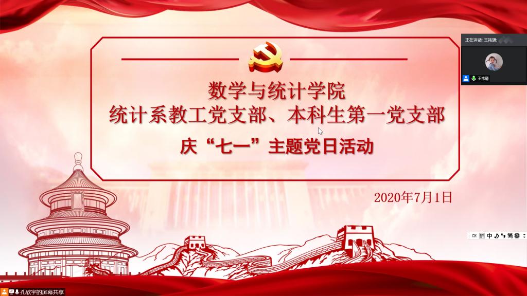 本站讯 为庆祝中国共产党成立99周年,讲述抗疫故事,领悟初心使命,7月1日下午,我院本科生第一党支部与统计系教工党支部通过腾讯会议联合开展了庆“七一”主题党日活动。77779193永利党委副书记王鹏飞应邀出席,活动由本科生第一党支部书记王祎璠主持。