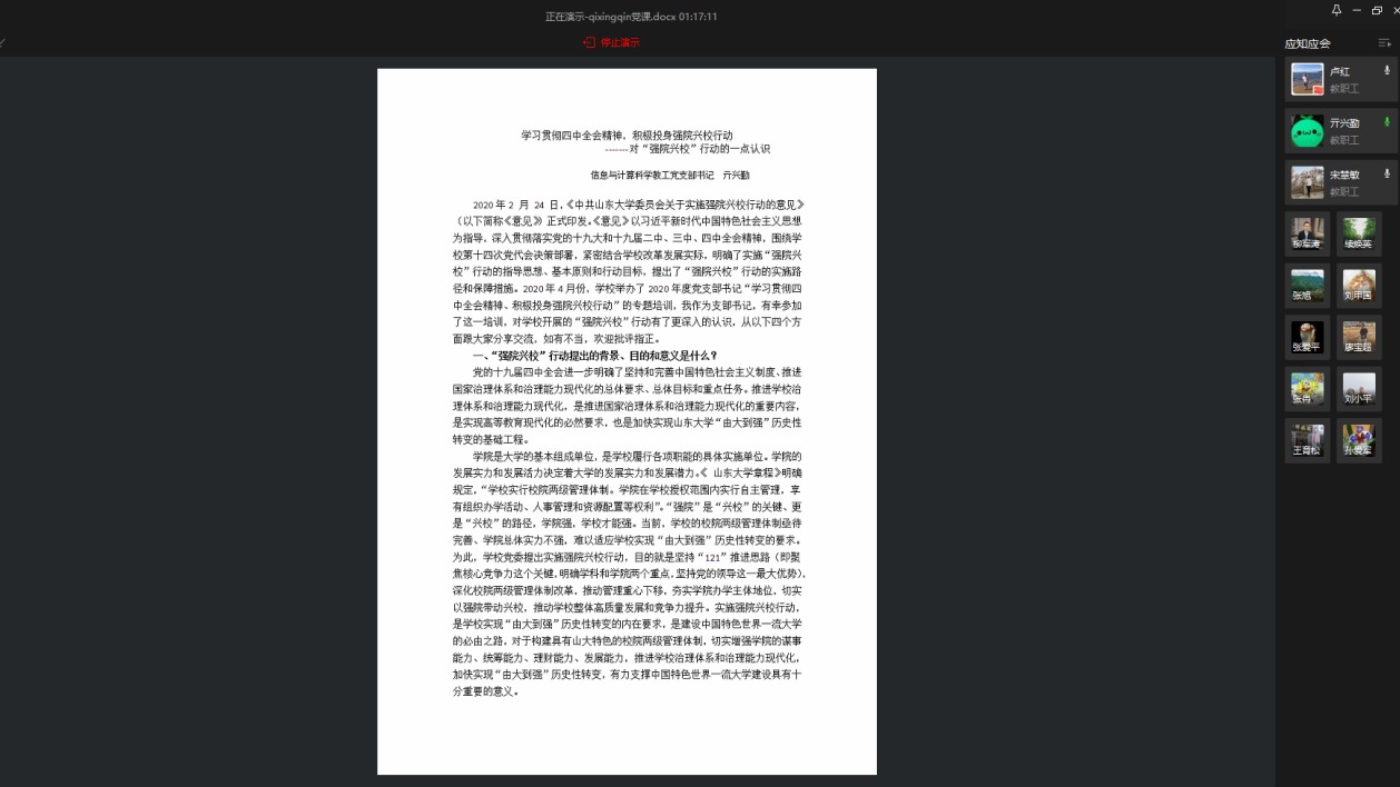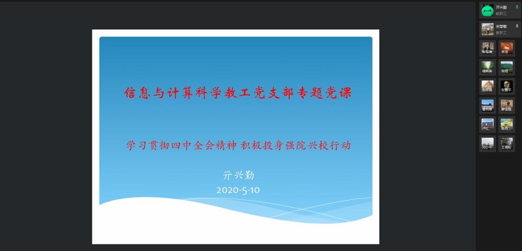 本站讯 5月10日晚7点,我院信息与计算科学系教工党支部通过企业微信召开了以“学习贯彻四中全会精神,积极投身强院兴校行动”为主题的支部书记上党课,支部成员围绕强院兴校行动积极研讨、建言献策。