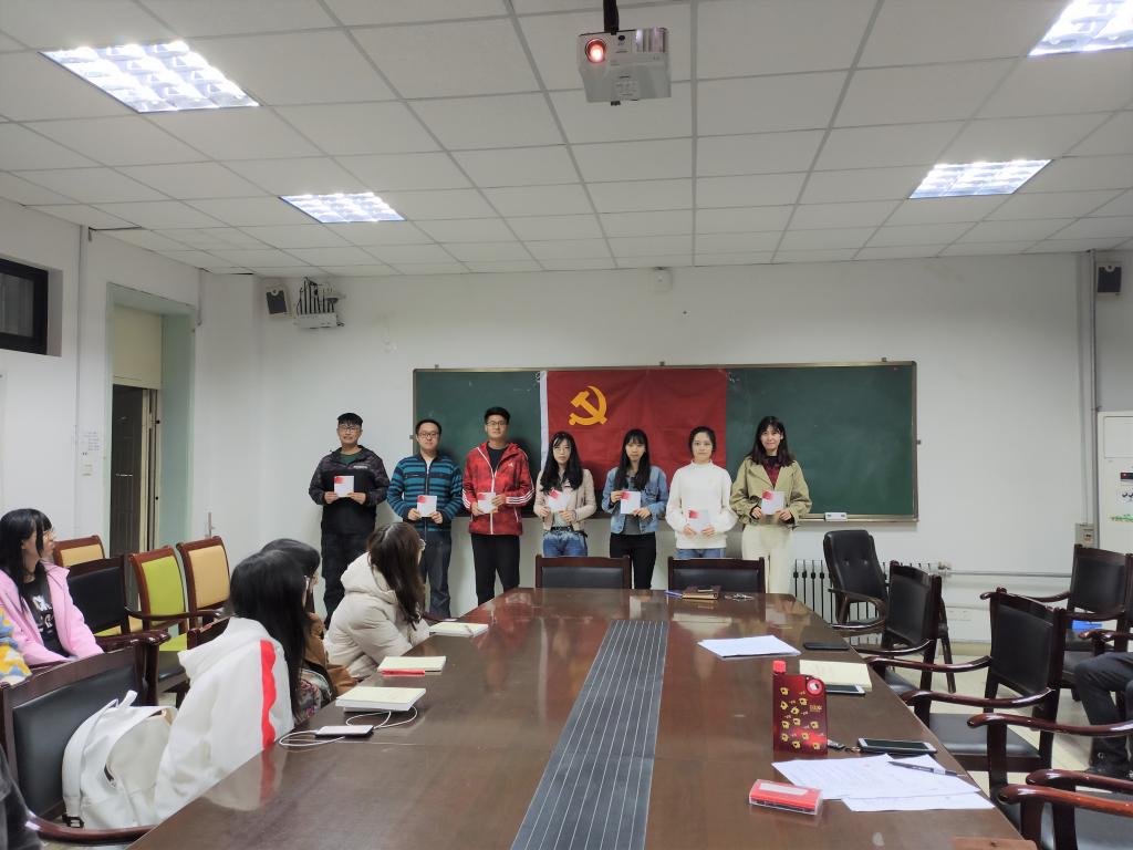 活动伊始,全体党员观看《画说党史》短片,重温党史大事记。随后,党支部书记王祎璠代表党支部委员会向过“政治生日”的学生党员赠送生日贺卡,以此激励、鞭策党员时刻牢记党员身份,切实增强党员的荣誉感、责任感、使命感。赠送后,各位党员和在座党员分享了自己的“入党初心”,以及入党后自己在党组织栽培下的成长与进步。与会的预备党员,也结合个人思想、工作和学习实际开展了交流,对照党章党规,查找自身差距,深入进行自我剖析,并纷纷表示要不忘初心,始终保持奋斗精神和革命精神,把“不忘初心、牢记使命”主题教育中的学习成效体现到增强党性、提高站位、发挥作用上来。活动中,在正式党员的领誓下,全体党员重温了入党誓词,并集中观看了《中国有了共产党》系列记录片,以此勉励各位党员不忘初心、砥砺前行。