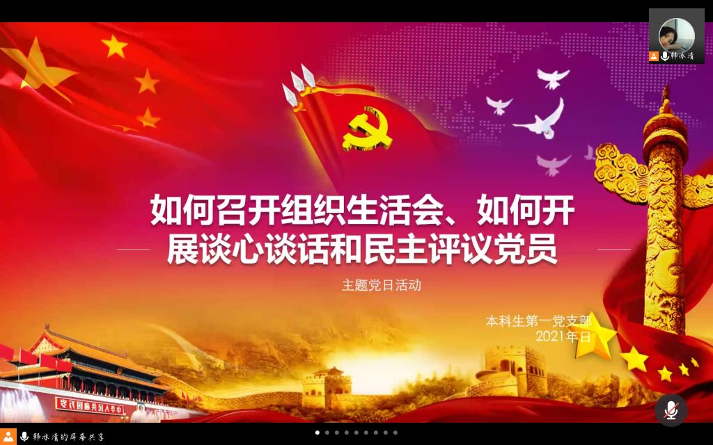主题党日活动中,韩冰清向大家详细介绍了组织生活会、谈心谈话和民主评议党员的具体流程、具体形式及各个环节的具体内容,强调要扎实抓好会前准备、高质量召开会议以及认真做好会后工作,并结合灯塔大课堂内容,进一步加强支部党员的思想认识,为开展好2020年度组织生活会打下坚实的思想基础。会上,本科生第一党支部书记王祎璠对支部党员提出几点希望:一是持续加强政治理论学习,利用好“学习强国”等平台资源,养成良好的理论学习习惯,经常性总结自己、提升自己;二是希望大家作为青年党员要以身作则,变被动为主动,以一名优秀共产党员的标准严格要求自己,在同学中树立先进典型形象,充分发挥先锋模范作用,以良好的精神面貌迎接建党100周年。