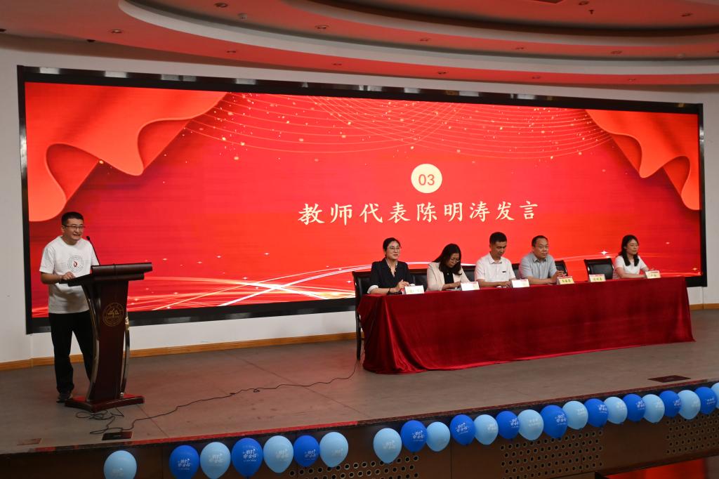 教师代表陈明涛老师以《数学分析》的“极限”开篇,结合课程中的“可导、收敛和误差估计”知识,分享对人生成长、发展和认知的理解和感悟。他讲到数学赋予大家的不是冰冷的符号,而是一套思维系统,希望同学们以“控制收敛函数”去面对未来生活的不确定性,以“柯西列”终会收敛的认知去应对可能遭遇的挫折。勉励学生坚持用微分看世界,看透它的本质,用积分过日子,积出璀璨的人生。