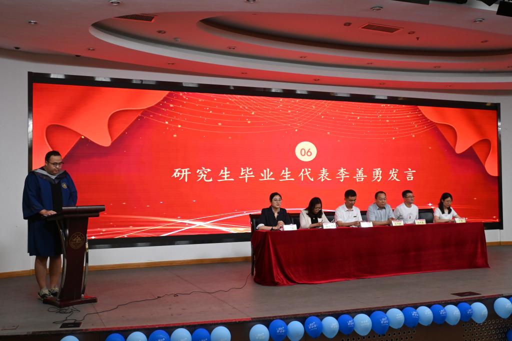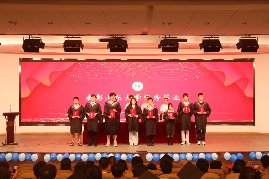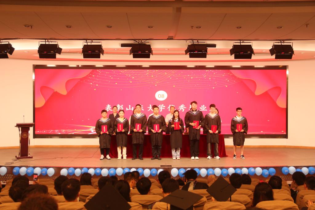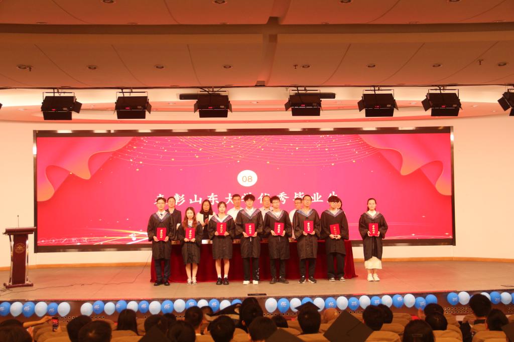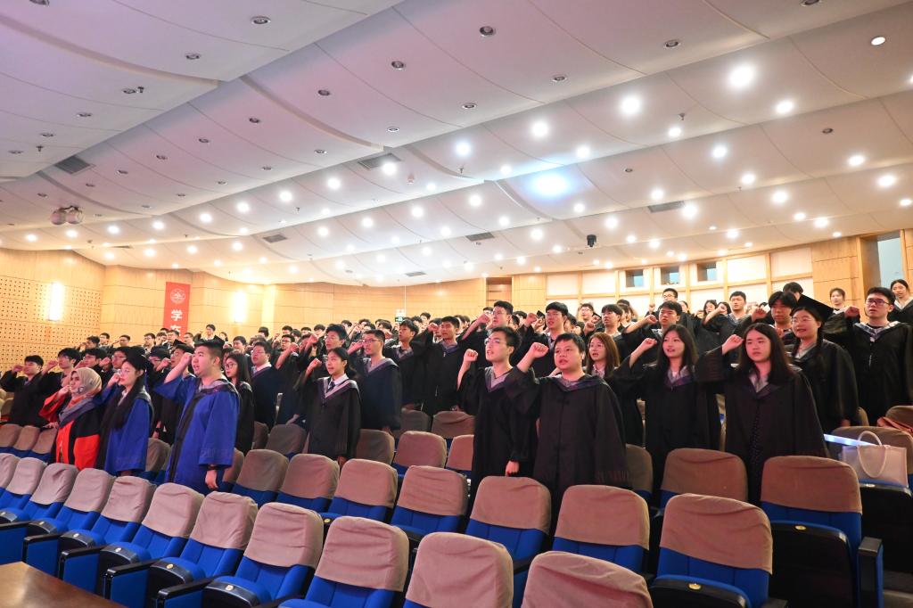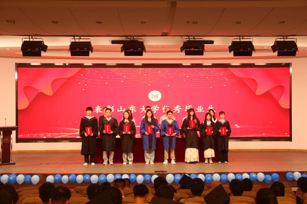 在校生代表张维佳发言中对学长学姐表示祝贺,并表示将以其为榜样,努力学习,踏实进取,与毕业生一起肩负起为母校争光、为国家效力的重任。本科生毕业生代表刘吉洋分享了大学四年的成长与收获,表达了对学院以及老师、同窗的感激之情和对母校的依依惜别之情,表示将弘扬和传承山大精神,在工作岗位矢志奋斗。研究生毕业生代表李善勇分享了在威海8年求学及做学生工作的经历,表示将在今后学院校友工作中发挥桥梁纽带作用,积极贡献力量。李善勇带领全体毕业生进行庄严宣誓。