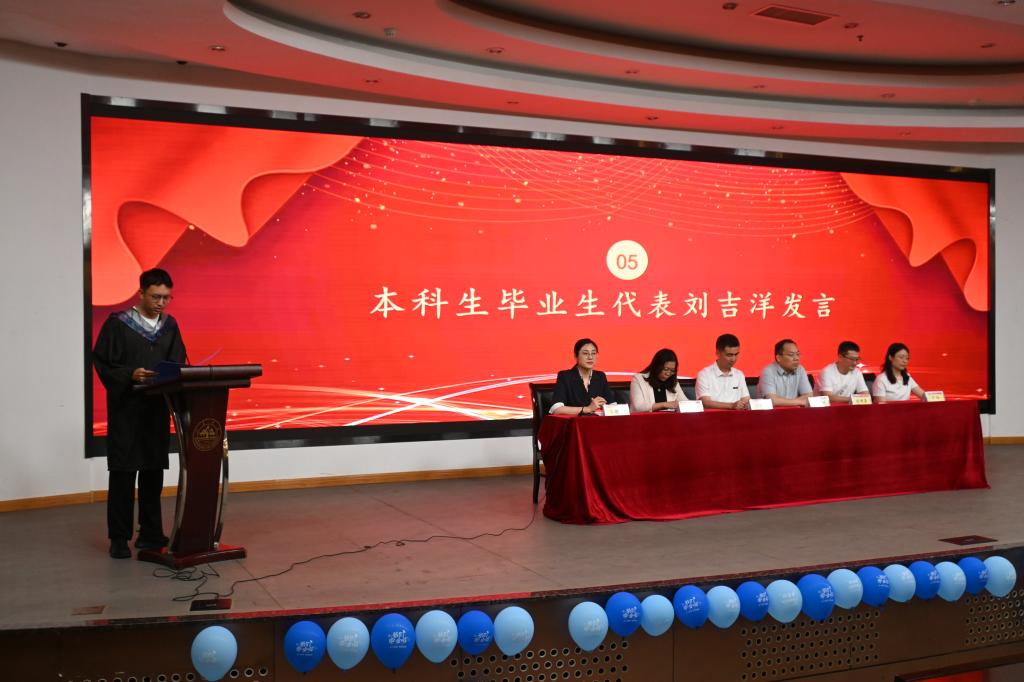 在庄严嘹亮的国歌声中,毕业典礼拉开序幕。常务副院长齐海涛致辞,代表学院全体教职工对2025届毕业生顺利毕业表示祝贺,肯定了毕业生在校期间取得的成绩与荣誉,寄语毕业生拥抱不确定性,做韧性十足、主动塑造未来的创造者;筑牢信仰根基,做胸怀家国、接续奋斗的笃行者;致知力行,做敬畏真理、笃行求实的躬耕者。
