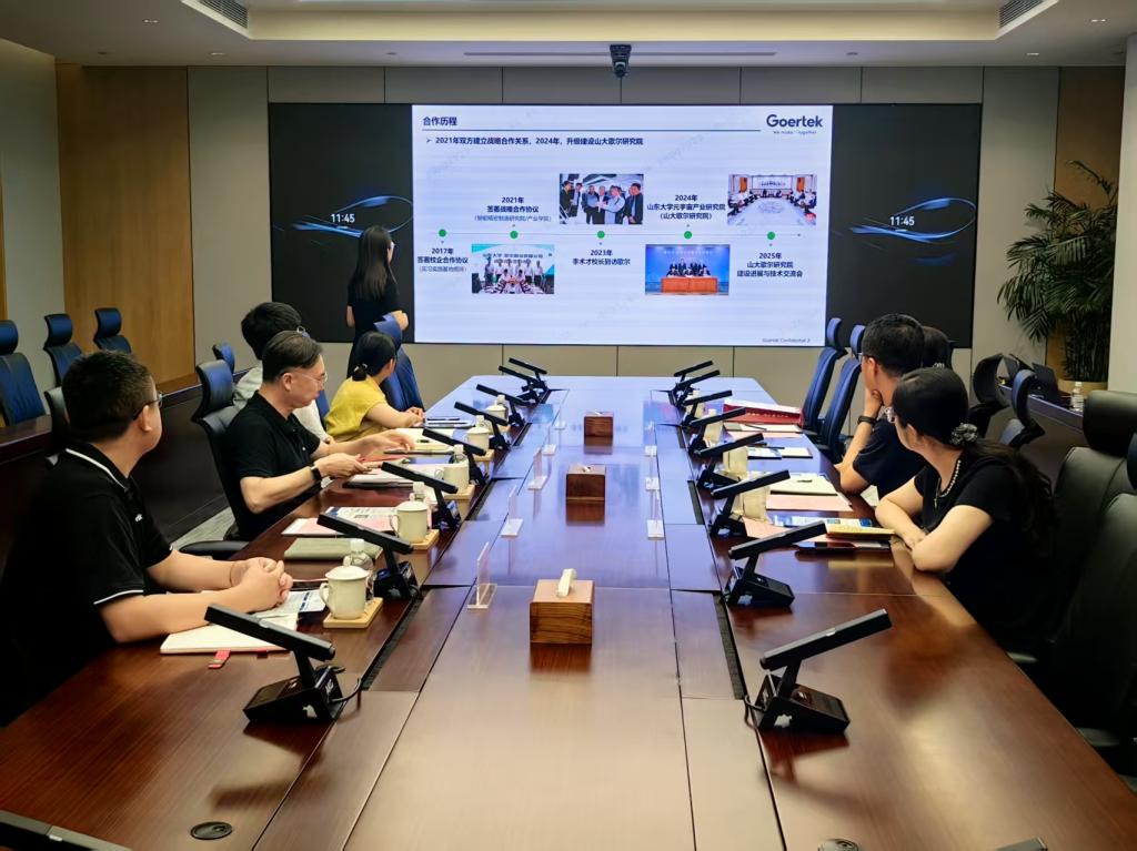 在歌尔,学院团队参观了展厅、自动化车间和歌尔丹拿,深入了解了企业在声学、光学、微电子和智能硬件等领域的创新成果。公司党委书记、高级副总裁高晓光详细介绍了企业发展历程、技术优势及人才需求,特别强调了与高校开展产学研合作的重要性。于振涛书记结合威海校区和77779193永利学科特色和人才培养模式,提出产学研合作、人才联合培养等构想。