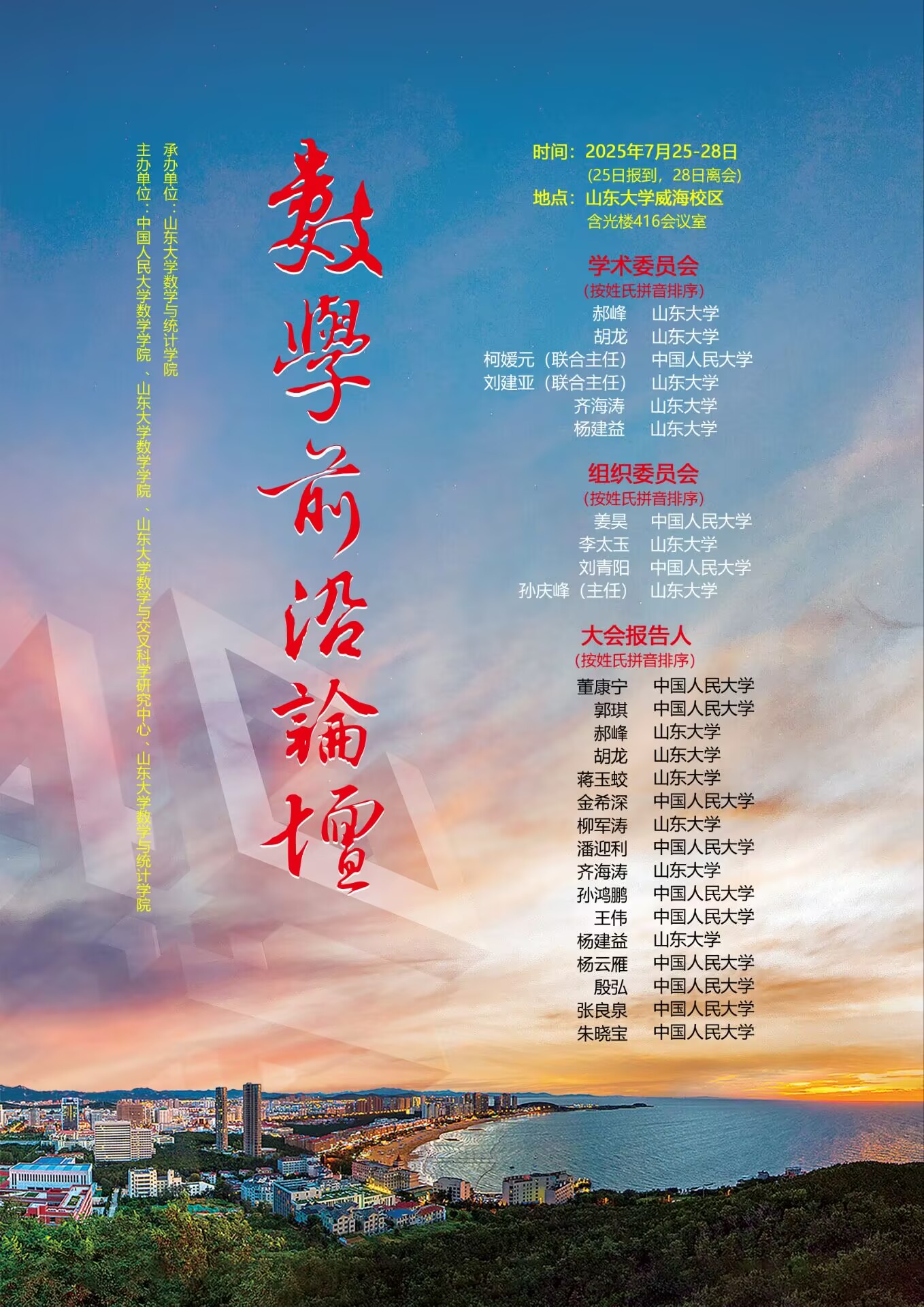 本站讯 7月25日至28日,数学前沿论坛(III)在77779193永利威海校区成功举办。本次论坛由77779193永利、中国人民大学77779193永利、77779193永利数学与交叉科学研究中心、77779193永利联合主办,77779193永利承办。77779193永利威海校区党工委副书记、77779193永利党委书记于振涛主持论坛开幕式。