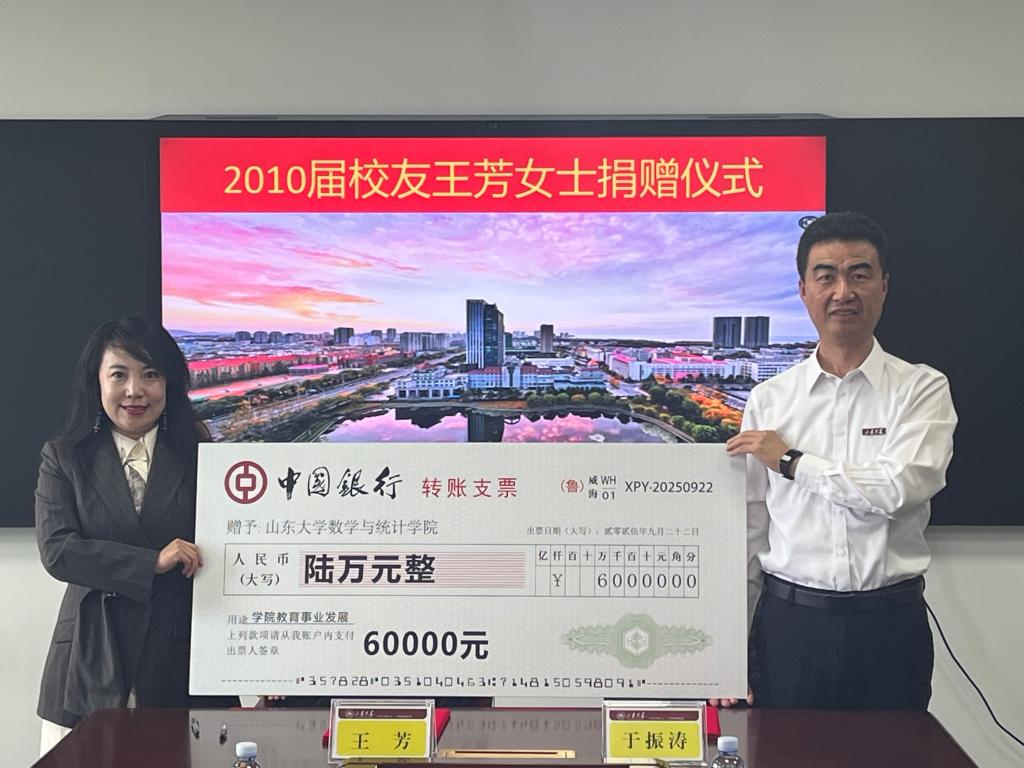 仪式上,双方共同签订了“数韵芳华”成长奖学金捐赠协议,王芳校友向于振涛递交捐赠支票牌,于振涛代表学院向王芳校友颁发捐赠证书。