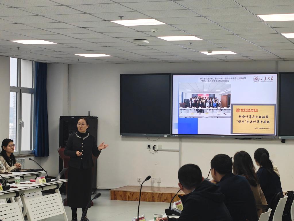 副院长亓兴勤汇报了2024-2025学年“科学计算与大数据暨‘曙光’先进计算菁英班”的建设情况,全面总结回顾了从课程共建、导师协同、学生培养、科研竞赛等方面的建设成效与发展亮点。