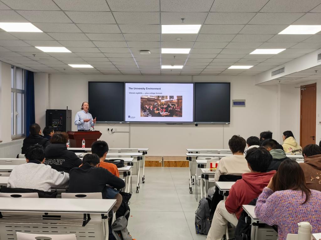 Douglas Smith首先从办学历史、学科特色、校园环境、学生活动等方面帮助学生了解杜伦大学,随后重点介绍了杜伦大学数学学科的办学特色、主要研究方向和优质教学资源,并详细阐述了数学学科“3+1+1”本硕联培项目的课程体系设置、师资配备、申请流程等内容。盛凯程结合自身海外经历,分享了参与项目所带来的视野拓展、就业和深造竞争力等方面的诸多优势。在问答互动环节,同学们围绕课程衔接的具体细节、语言成绩要求等问题进行了咨询,各位嘉宾逐一细致解答。