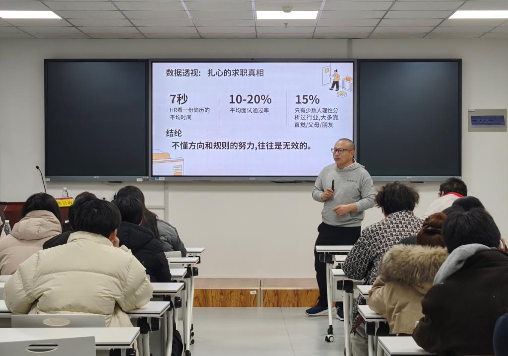 讲座中,熊岩海系统梳理了求职破局的三步方法论,为学生构建清晰的求职思路。他强调“选定赛道”是求职起点,建议学生综合专业背景、家庭资源与性格特质锚定目标行业与岗位,深入调研领域产业结构、头部企业及用人标准,摒弃简历海投的盲目策略。在“扎实能力”层面,他指出数学与统计专业学生在算法、数据分析领域具备天然优势,应通过参赛、实习、科研等多元路径积累实践经验,同步强化沟通表达、抗压能力等软实力。针对如何将个人优势“精致呈现”,熊岩海从简历撰写到面试技巧给予实用指导,强调简历需突出岗位匹配度,用量化成果佐证能力;面试前应充分调研企业背景,灵活应对AI面试、无领导小组讨论等多样化考核形式。