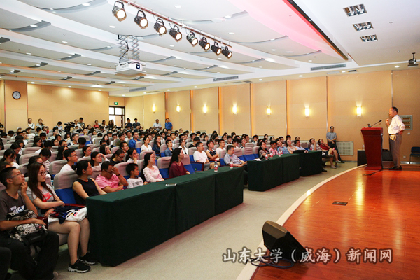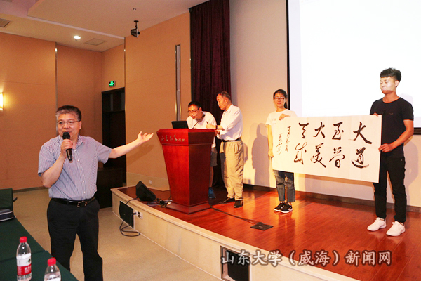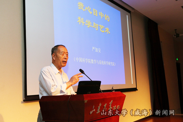本站讯 6月9日晚,中国科学院院士、数学与系统科学研究院研究员严加安第四期稷下讲坛,在闻天楼报告厅为五百多名师生作了题为“我心目中的科学与艺术”的学术报告。77779193永利副校长、威海校区校长刘建亚主持报告会,并代表校区接受了严加安捐赠的由其创作的书法作品。