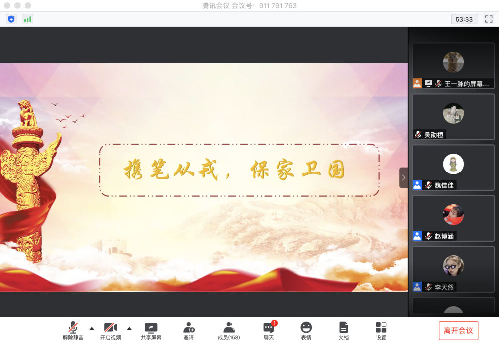 会上,为进一步激发广大同学的爱国主义情怀、弘扬抗疫精神,学院邀请艺术学院2019届毕业生,挂职于枣庄滕州市南沙河镇北池村的张达做专题报告,张达结合个人经历分享了应征入伍的部队生活和投身疫情防控工作第一线的工作感悟,他的报告,展现了大学生退役士兵的风采,传递了枣庄市防疫先锋“发现榜样”人物抗疫模范力量。张达的讲述,使学院学子深刻感受到了彰显在每一位防疫一线工作者身上的抗疫精神,深刻认识到了当代青年的责任担当和青春力量,树立了良好的先锋形象。随后,学院通过视频展现了我院抗疫一线学生志愿者的先进事迹,赞扬学院每位学子居家隔离、坚守岗位、共克时艰、同心抗疫的爱国担当。