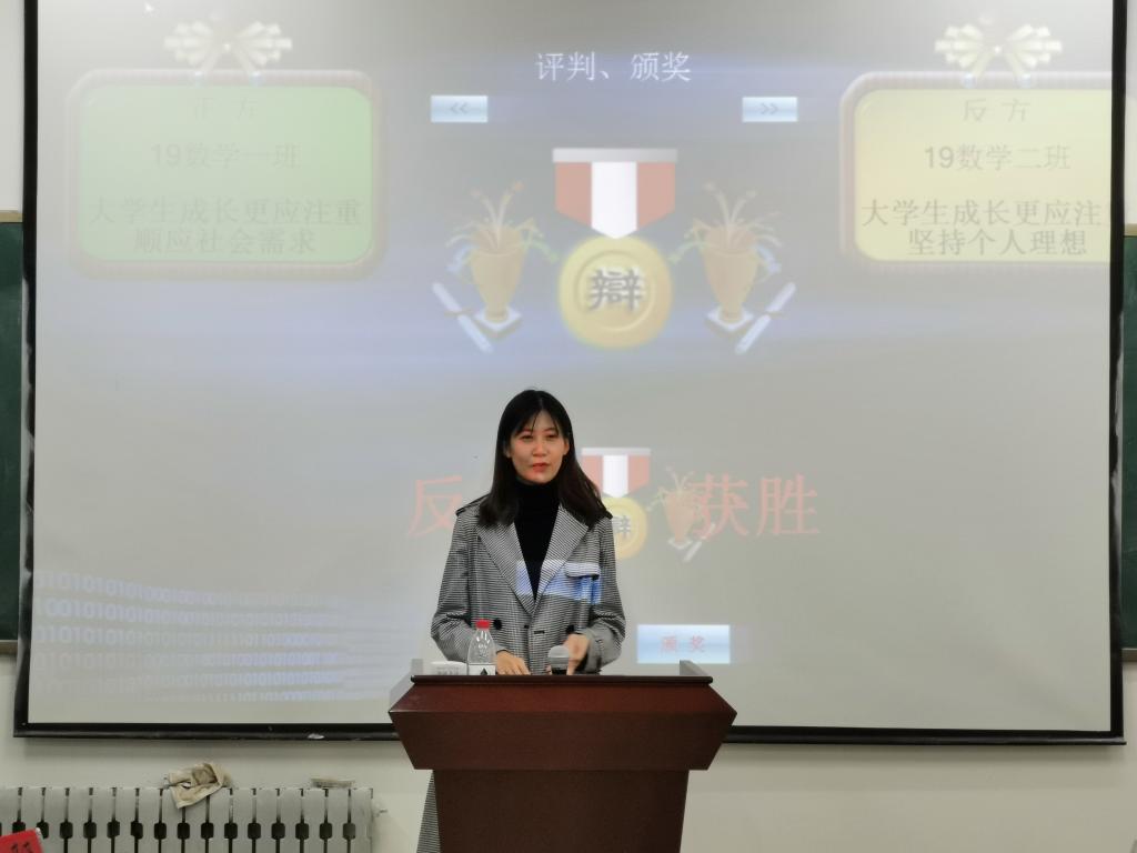 本站讯  为培养学生的语言表达能力和思辨能力,我院举办了数学嘉年华之“数韵风采,谁语争锋”新生辩论赛。经过三场小组赛的激烈角逐,2018级数学数科联队、2019级数学三班数科联队、2019级数学一班、2019级数学二班四支队伍脱颖而出。1117日下午,决赛阶段在图东环楼304室举办,望言辩论社指导教师王祎璠出席比赛