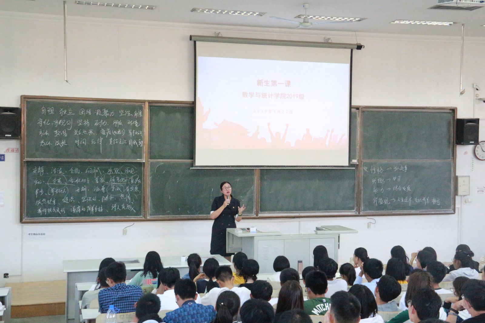 本站讯 9月22日下午,我院于图东教学楼205室举办“励志周末”特别活动——“新生第一课”主题讲座。学院党委副书记王鹏飞担任主讲嘉宾,新生辅导员王祎璠和全体2019级新生参加了本次活动。