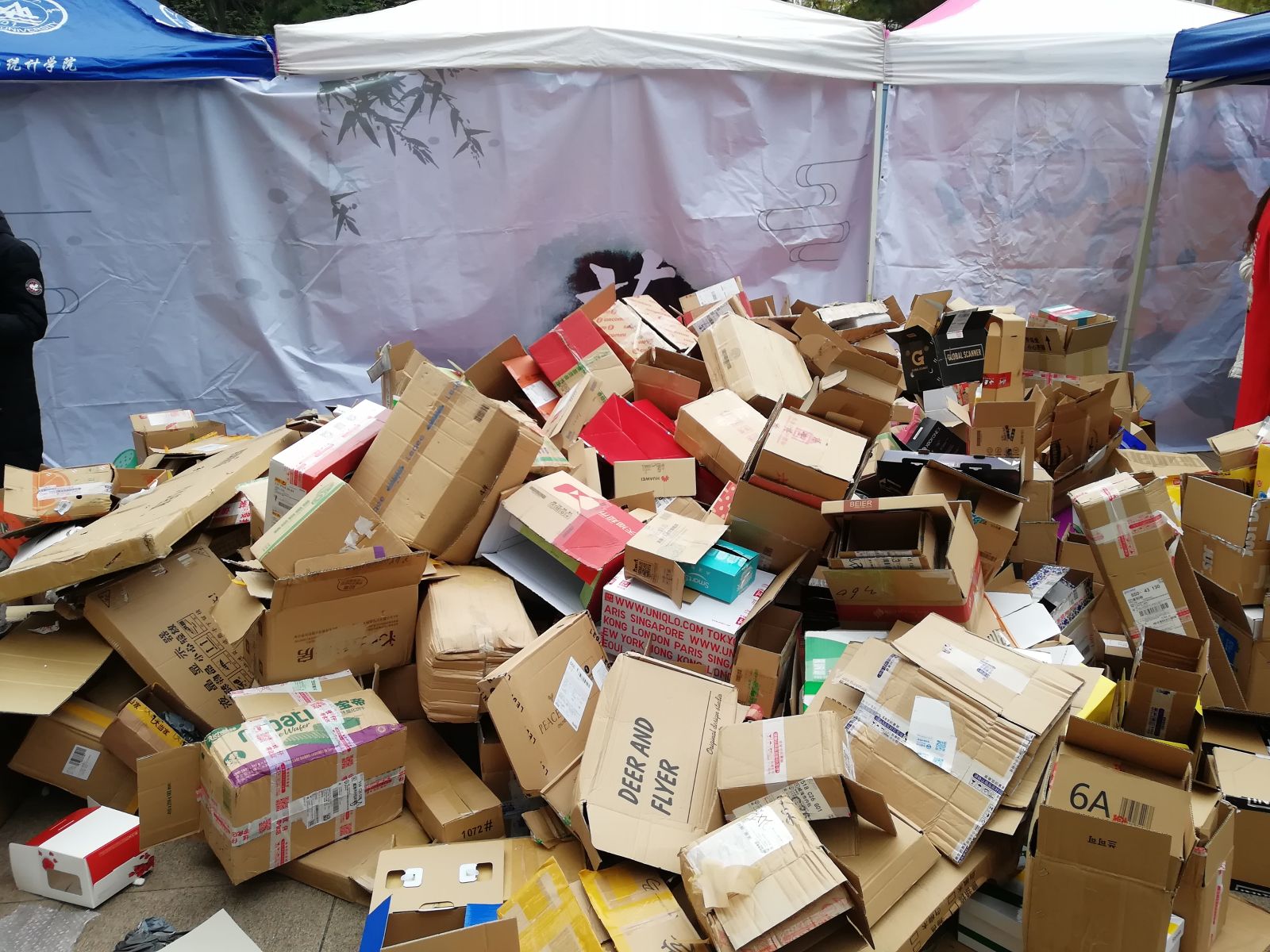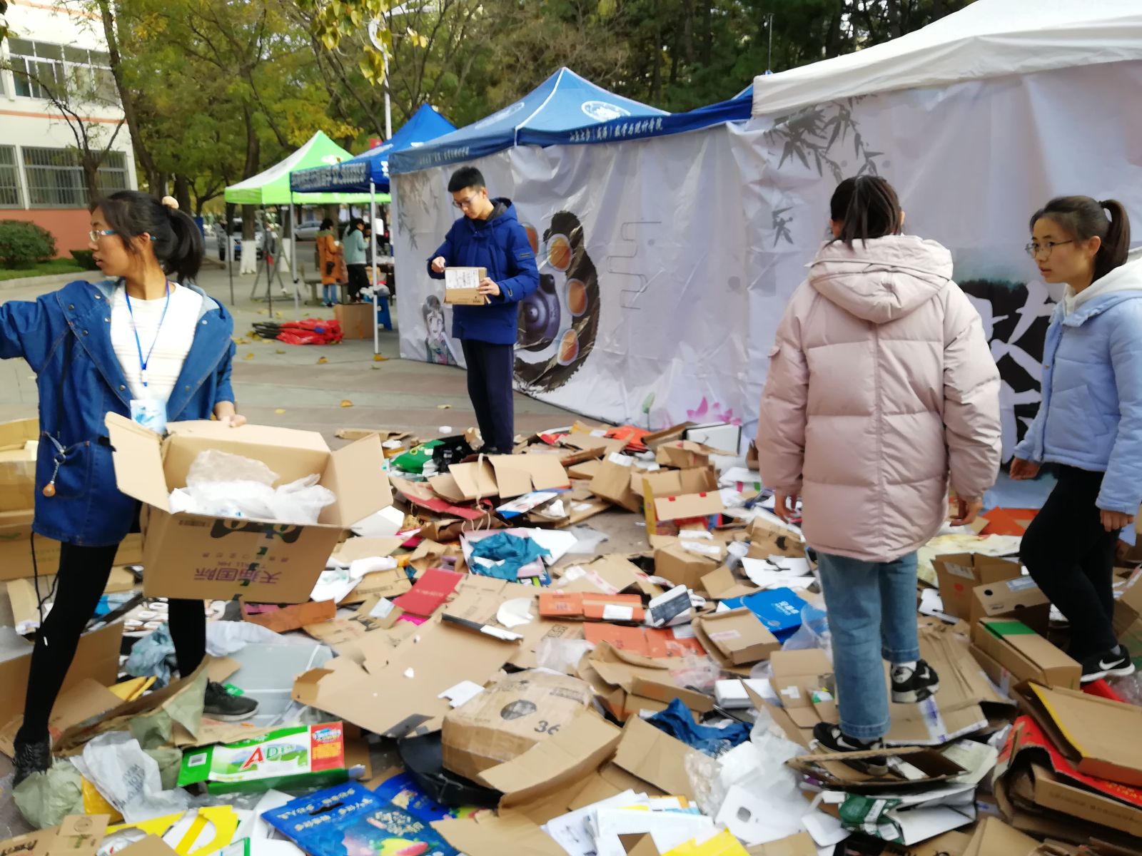 本次活动共分为蒙牛广场定点收集、志愿者进宿舍收集以及废旧纸箱的处理三个部分。早上7点30分,定点收集活动准时开始,同学们纷纷把废旧纸箱送至蒙牛广场的摊位,并参与抽奖活动。在提供纸箱、奉献爱心的同时,同学们也获得了一些奖励和惊喜,这让现场气氛十分热烈。中午11点20分,志愿者们在蒙牛广场集合,并在青年志愿者协会干事们的带领下,有序地进入学生宿舍收集纸箱。在宿舍,同学们积极地配合志愿者们的工作,为纸箱回收活动贡献自己的力量。提供纸箱数目较多的同学获得了志愿者发放的参与卡,同学们凭借此卡到摊位进行了抽奖。在摊位和宿舍均收集完毕后,志愿者们将收集到的纸箱打包处理好卖给废品回收站,并用所得经费购买小礼品捐赠给威海市儿童福利院,为福利院的孩子们送去一份爱心。至此,“双十一,纸箱也想找个伴”快递纸箱回收活动圆满完成。