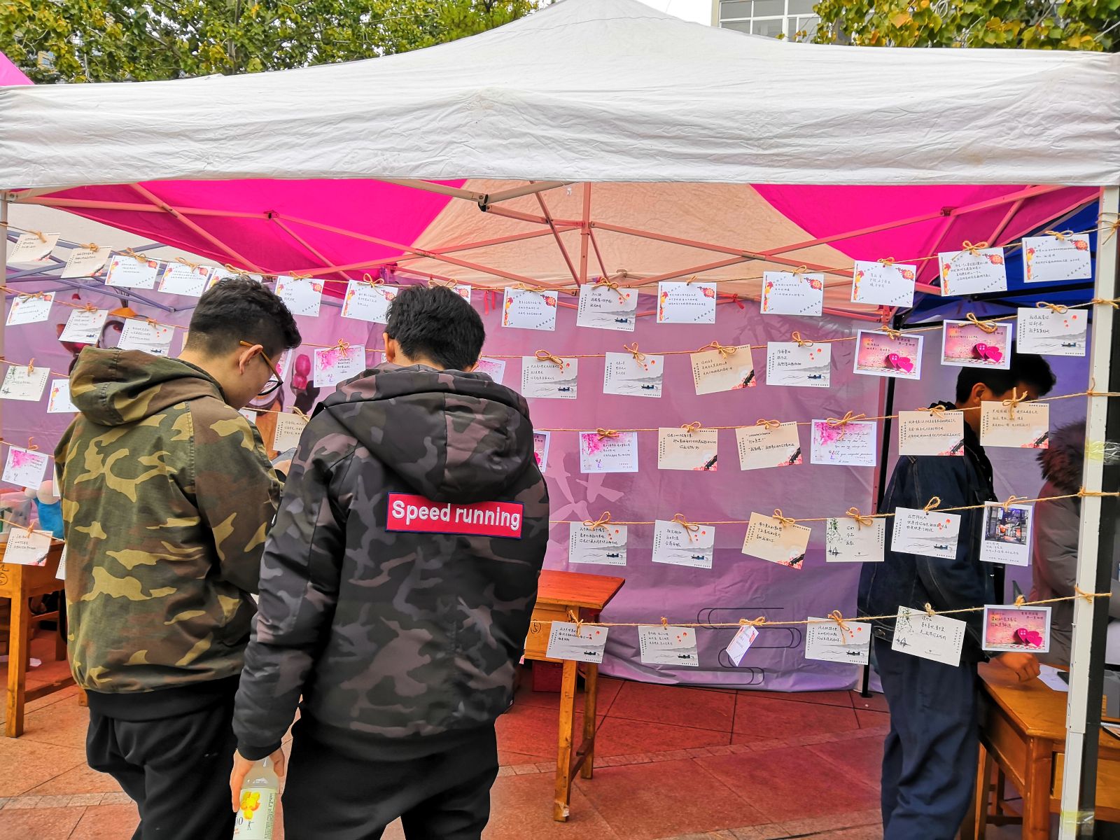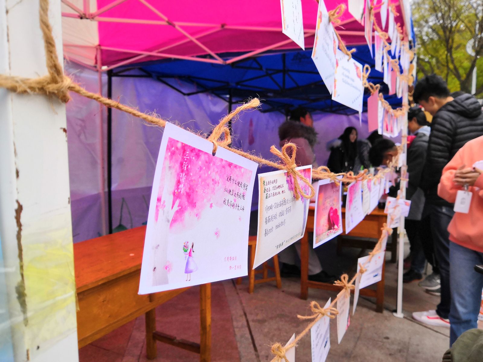 早上八点,三行情诗大赛正式拉开序幕。活动前期的大力宣传以及活动现场的精心布置吸引了众多同学。在现场作品征集环节中,同学们将自己的真实情感按照三行情诗的形式进行创作,字里行间流露出来自亲情,友情和爱情的寒暄与感动。在情诗密码环节中,同学们积极挑战各类情诗谜语,通过自己缜密的思维进行解答。在坦白墙环节中,同学们回答了卡片上的与情感、成长、自立有关的问题,引起大家的阵阵思考。与此同时,抽奖与奖品发放环节也在如火如荼地进行。比赛一直持续至下午四点,在轻松愉悦的氛围中拉上了序幕。