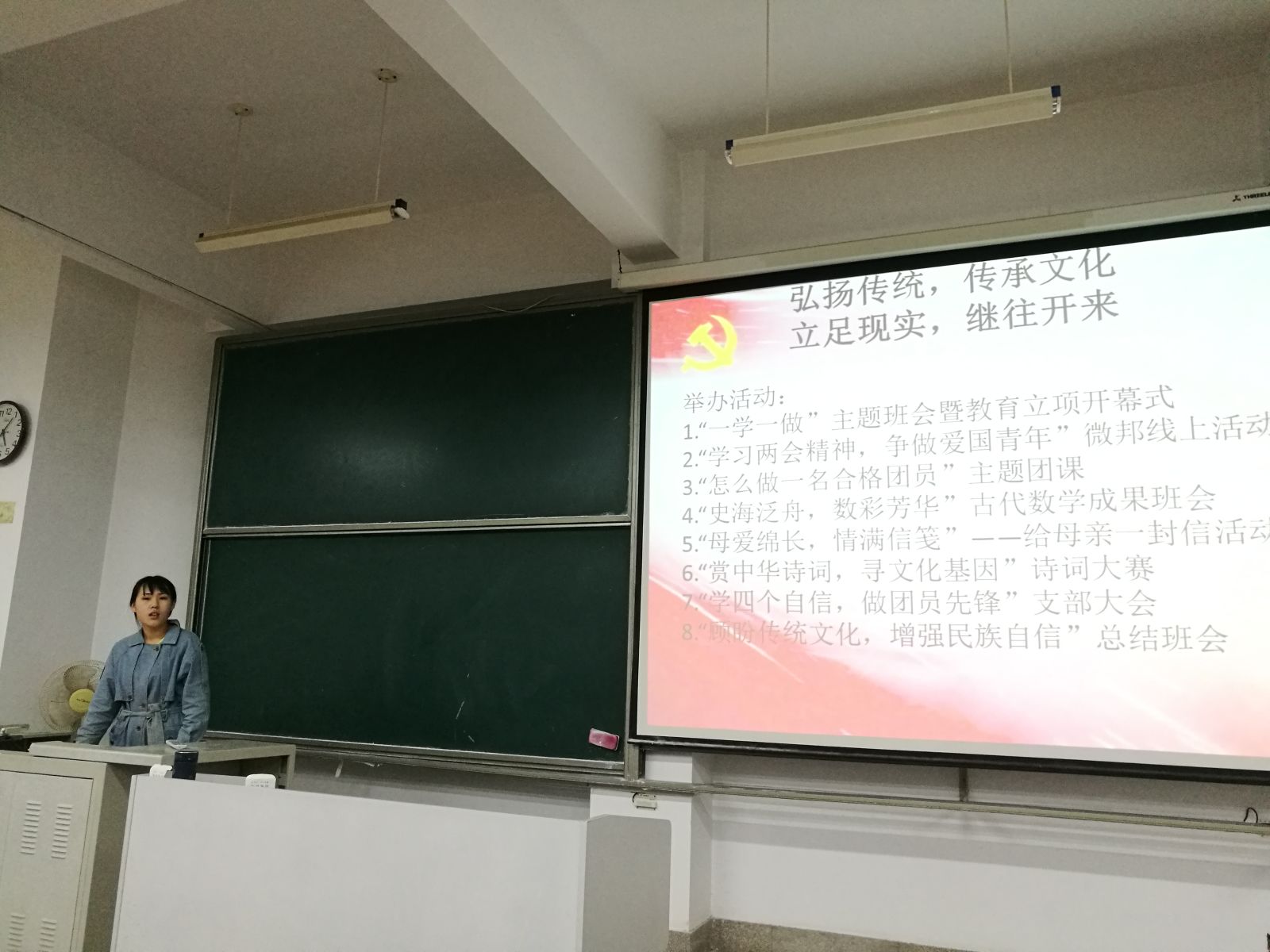 下午4点,活动准时开始。首先,孙妍以南怀瑾、钱穆等爱国志士的名言开场,强调民族文化的重要性。随后,她从汉字起源开始,概括性描述中华文化的源远流长,从中国传统文化发展的基本脉络、中国传统文化的核心内容、中国传统文化的哲理、中国传统文化的当代价值四个方面展现中华文化的博大精深。接着,孙妍同学分析我国的传统文化文化现状,指出当前存在的外来文化冲击传统文化、“文化断层”等文化危机,并请同学浅谈对于这一危机的看法。闵雅同学发言说:“相信每个寒窗苦读12载的学生都知道中华文化“源远流长、博大精深”,但是我们真的知道中华文化源远流长、博大精深在哪吗?”并强调“很多青年对传统文化存在误解”。接下来,孙妍结合之前的教育立项活动,探讨文化危机的解决之道,并对之前的活动进行总结。最后,孙妍呼吁同学们以传统文化为根,继往开来。至此,本次班会落下帷幕。