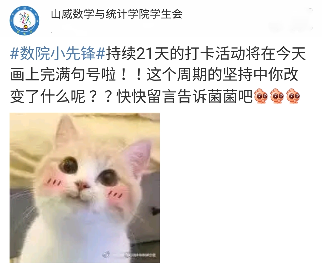 本站讯 4月5号至4月25号期间77779193永利学生会举办了为期21天的“数院小先锋”微博线上打卡活动,学生会全体成员参与了此次活动。