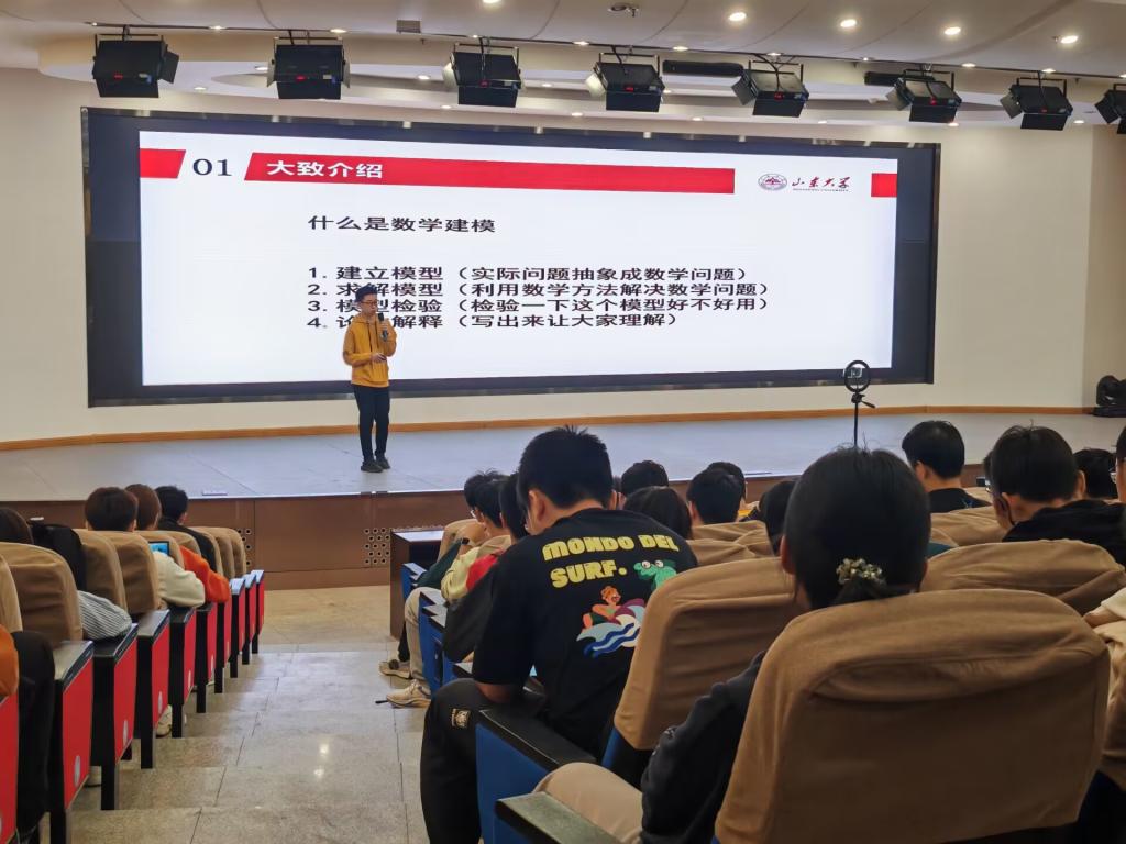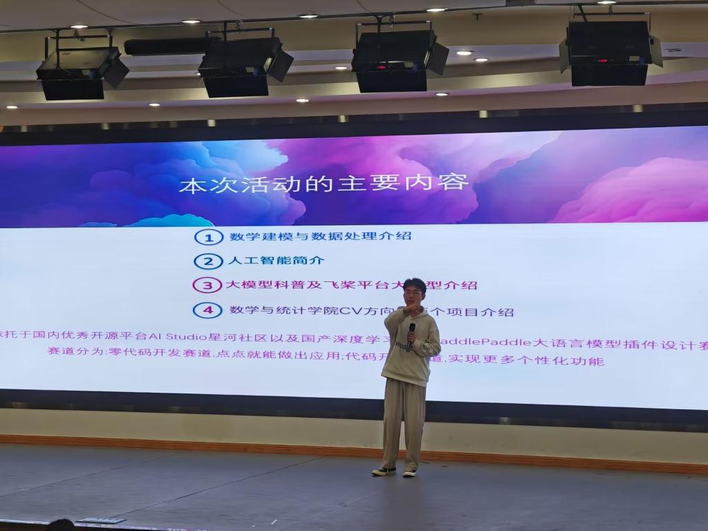 讲座开始,数学建模国奖获得者李洺锴从比赛简介、比赛软件应用和比赛经验三方面,带领大家认识了数学建模的全过程。李洺锴对数学建模准备过程中组队、队员磨合和论文书写等常见问题做了经验分享,同时他还对AI在学科竞赛过程中的应用做了进一步说明,并提醒同学们要善于且谨慎使用AI工具。随后,数据科学协会骨干葛鸿宇从数学问题的算法优化出发,引入了此次讲座的核心内容:回答什么是AI以及介绍百度飞桨大模型框架。葛鸿宇在介绍时,结合我国政策和行业现状,从贴近生活的案例,采用互动的形式,带领同学们认识了智慧工业、智慧农业等应用领域,还带领同学们体验了唤醒古人、老照片修复、文字提取等AI应用。最后,创新创业协会会长范升华从服务优势和组队优势两方面,对创新创业协会的职能和特色进行了介绍,并鼓励同学们积极学习AI等科研工具,利用协会的平台优势,积极参与到各类科研活动中。