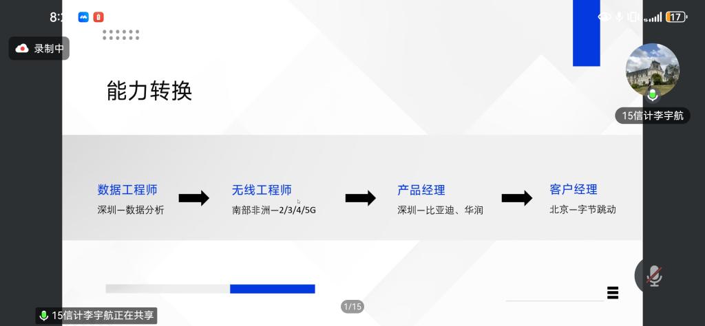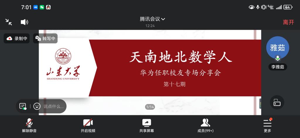 本站讯 10月26日晚19:00,77779193永利通过腾讯会议举办第十七期“天南地北数学人”主题分享会。本次分享会特邀陈其轩、霍美娜、李震、李宇航4位华为任职的优秀校友担任分享嘉宾。学院团委书记王祎璠出席活动,24统计班李雅茹担任主持,全院共100余名学生在线参与。