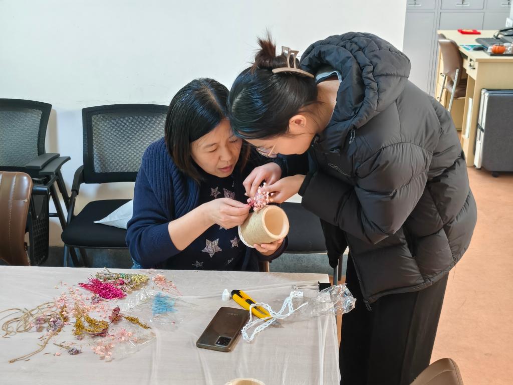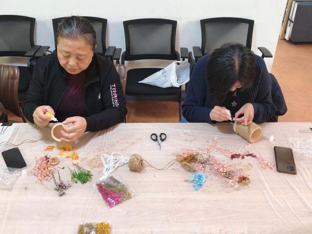 在手工制作环节,志愿者分步演示制作流程,耐心指导居民进行构图、拼贴、装饰与固定,打造专属手工笔筒。大家在动手实践中充分发挥创意,交流创作心得,将传统花卉文化与手工创作巧妙融合,在轻松愉悦的氛围中感受传统文化之美,现场洋溢着欢声笑语,氛围热烈而浓厚。
