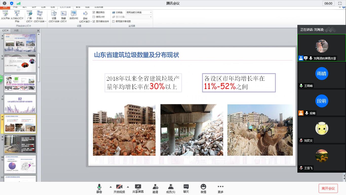 调研开始前,团队根据山东省建筑垃圾治理领域部分专家和部分社会实践类比赛评委的建议确定了本次调研需要重点了解的内容,在大量文献研究的基础上,团队针对政府、建筑垃圾处理企业以及相关协会三个不同的主体分别设计了访谈问题。在与前期同团队合作过的14家访谈单位确定了访谈时间和访谈形式的基础上,团队根据相关单位的推荐和研究内容,分工查阅信息并进行联系,最终共计22家单位接受了团队访谈。8月10日至21日,通过在团队成员所在的地区采取线下的走访形式,在其他地区通过线上电话访谈、电子邮件等形式进行,团队通过多种形式的访谈确切了解了建筑垃圾的地区现状及治理特点。在云端访谈中,团队针对各地区的住建局、相关企业、协会等发放问卷并通过多次的电话、邮件来深入了解地区建筑垃圾治理方面存在的问题、相关具体数据、具体政策法规的落实程度、对未来的规划以及区域治理的特色,通过后期的整合获得大量详细的调研资料。在线下访谈中,团队更进一步了解到各单位相关负责人对建筑垃圾管理的想法,学习了一些先进的建筑垃圾管理经验,为团队提出推进建筑垃圾资源化利用的措施以及科学的建筑垃圾管理模式奠定基础。8月22日至23日,团队对已经整理好的资料进行汇总并分工针对不同地区、不同主体对资料进行分类分析,同时结合所查资料,通过word、PPT等形式形成资料总结。8月24日,团队通过腾讯会议进行了成果汇报及头脑风暴,并总结了本次调研不足和值得借鉴的地方,为下一次的社会实践奠定基础,指导老师对本次实践进行了点评并提出了指导意见。