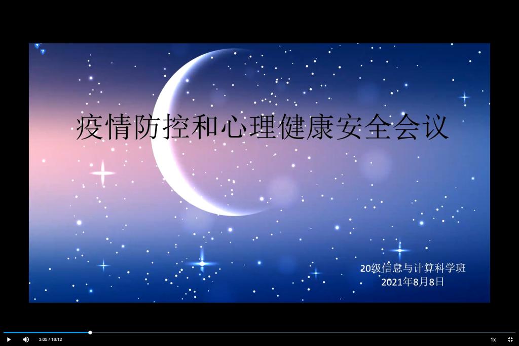 本站讯为响应国家疫情防控政策,提高学生假期防疫意识,8月8日上午,77779193永利2020级信息与计算科学班准时召开“疫情防控和心理健康安全”线上班会。本次班会由2020级信息与计算科学班生活委员梁钰峰,心理委员赵文硕、倪嘉杭主持。2020级信息与计算科学班全体同学参与。