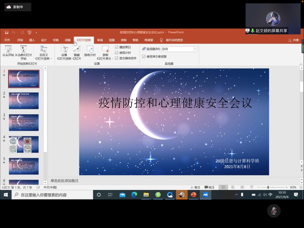针对疫情可能带来的影响,赵文硕和梁钰峰就疫情防控和心理健康安全进行说明。赵文硕提出,面对疫情时,要保持正确的心态;面对谣言学会理智分析;居家时,要保持适当的运动,增强体质,缓解压力;正确运用相关小程序,关注疫情情况;在面对居家可能会面临的心理健康问题,要重视并且学会积极疏导,及时寻求帮助;做好自身防护,及时注射疫苗,非必要不出门。随后,梁钰峰向同学展示了截至8月8日疫情实时大数据报告,说明了当今疫情涉及范围与传播链感染的严重程度,并介绍了此次疫情毒株——德尔塔变异株与先前疫情毒株特性的不同之处,以及个人防护措施和疫情下心理健康疏导的不同方式。
