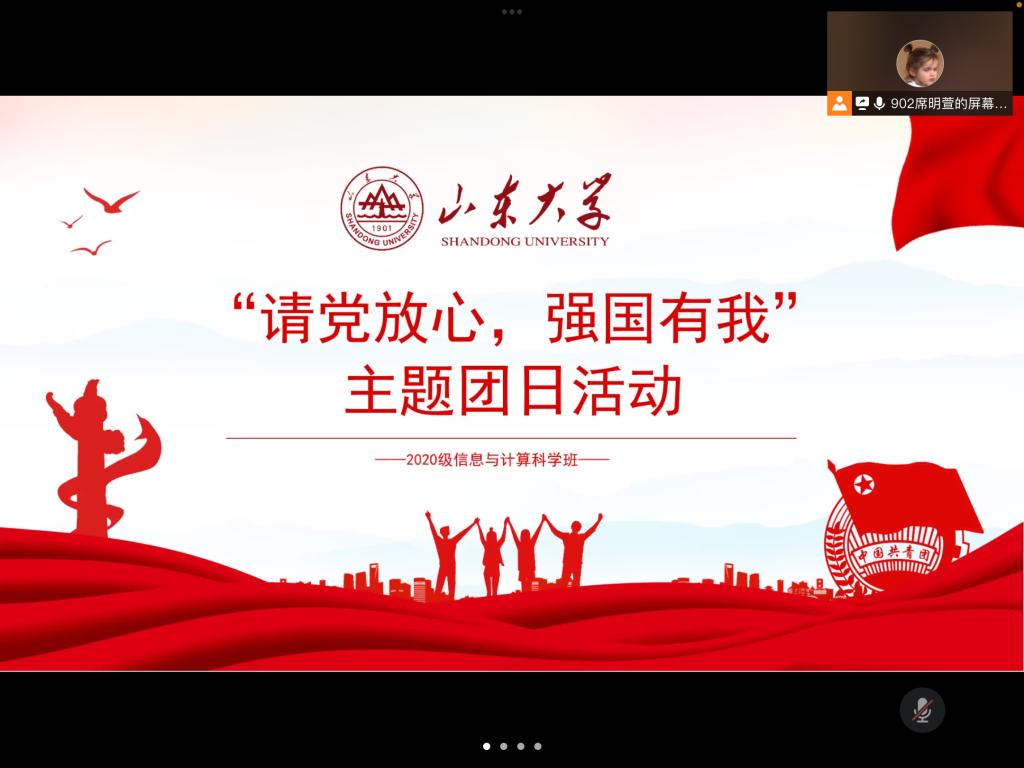 本站讯 10月26日下午,77779193永利2020级信息与计算科学班举办“请党放心,强国有我”主题团日活动。该活动由团支书席明萱主讲,2020级信息与计算科学班全班同学共同参与。